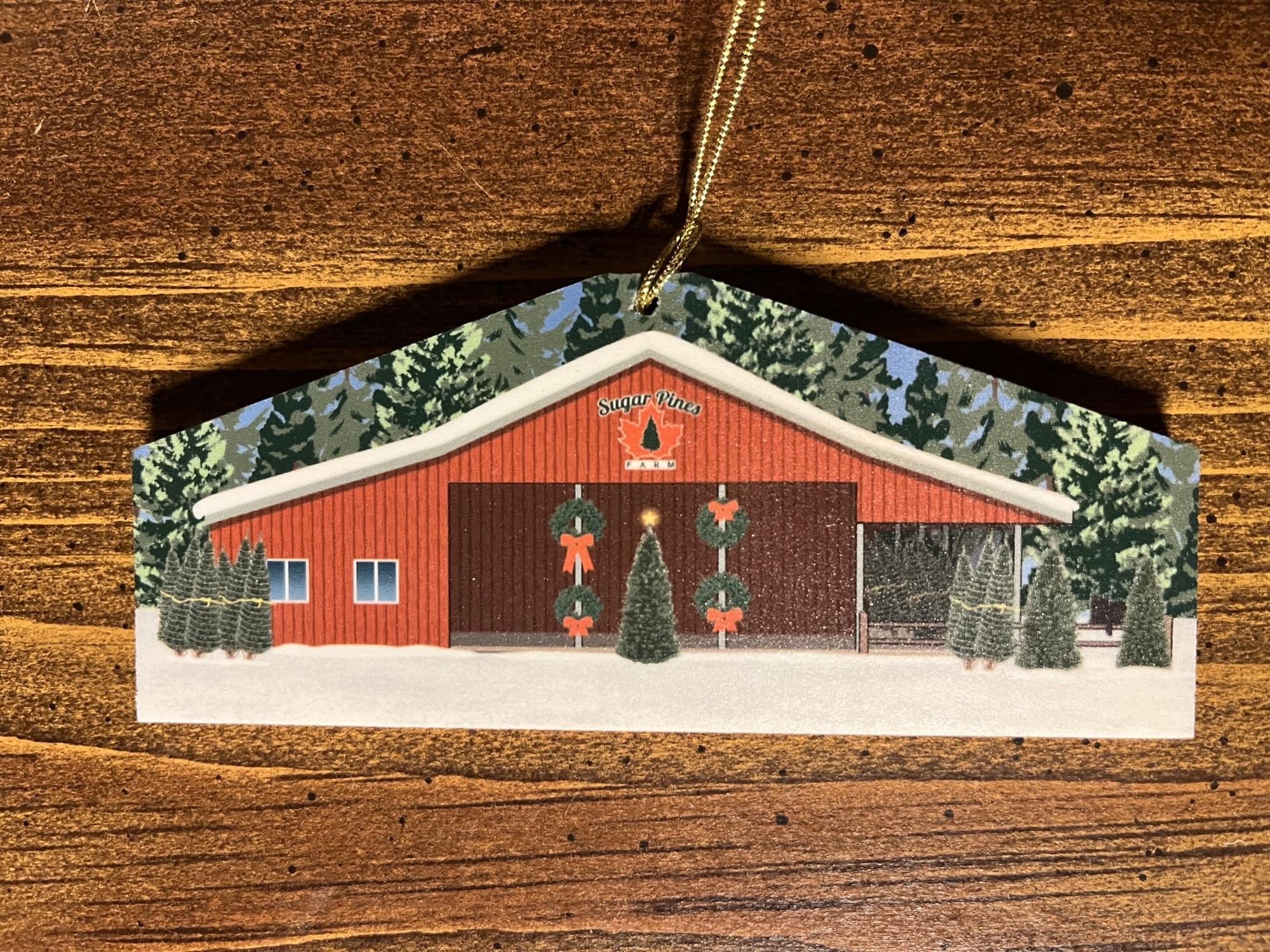 Sugar Pines Farm ornament, hand painted on wood, by The Cat’s Meow Village (~5 in. wide)