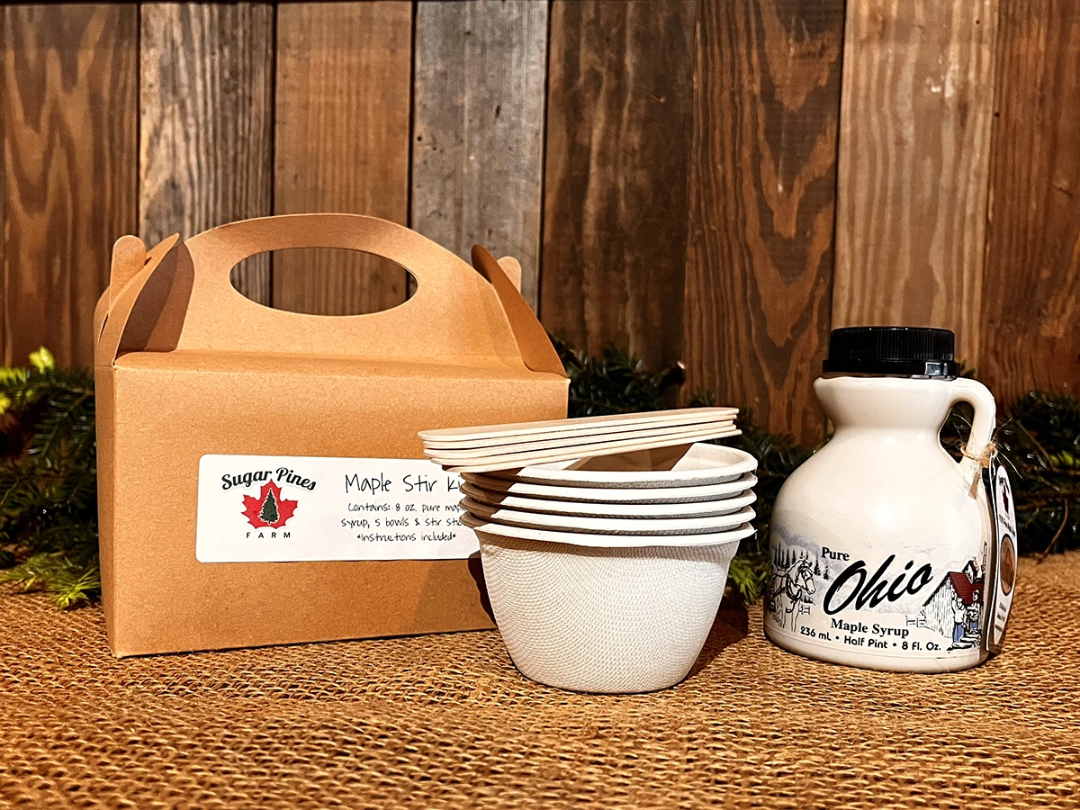 8 oz. pure maple syrup, 5 bowls and stir sticks for making delicious maple stirs (instructions included)